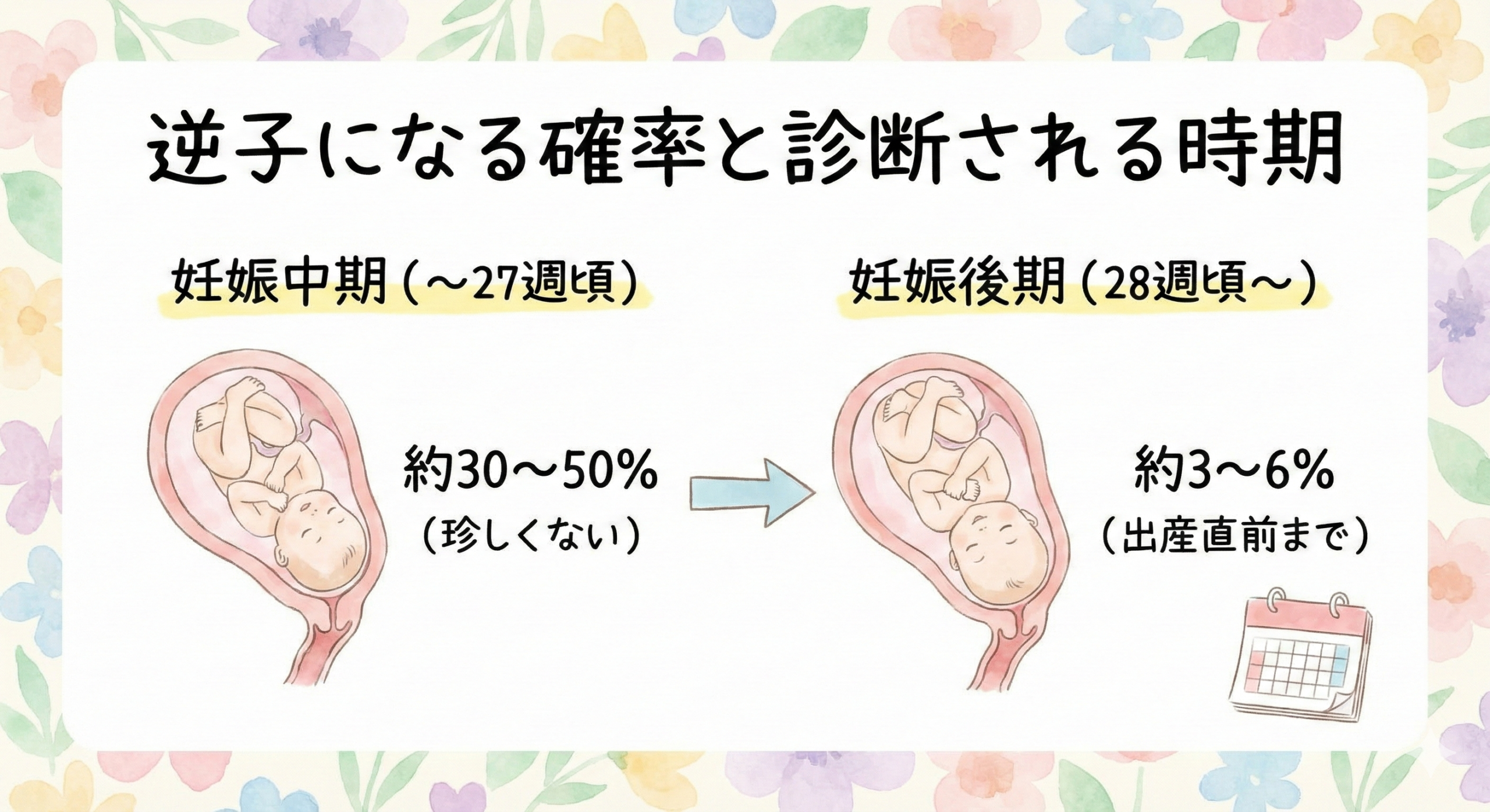 逆子は妊娠週数によって頻度が大きく変わるため、「いつ指摘されたか」が重要なポイントになります。