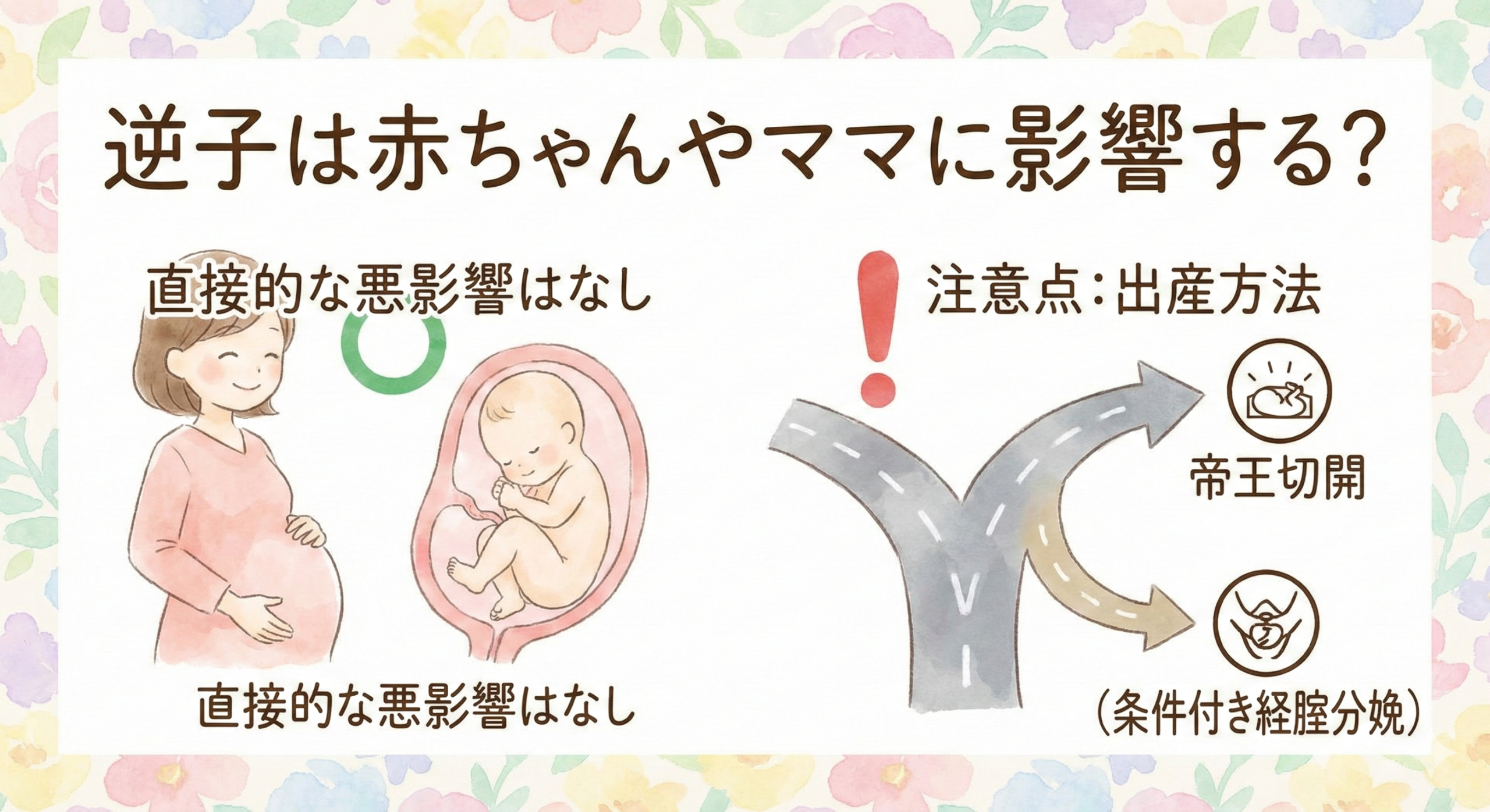 逆子であること自体が、赤ちゃんの成長や妊婦さんの健康に直接的な悪影響を及ぼすことはありません。 必要以上に不安になる必要はありません。