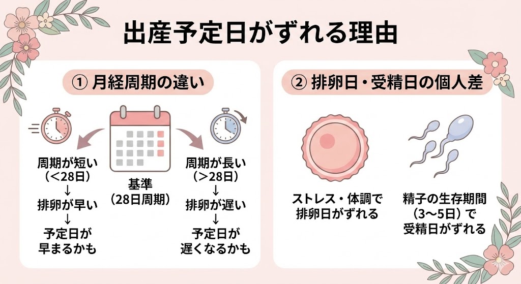 出産予定日は、一般的に 最終月経の開始日から280日(40週) を基準に計算されます。しかし、月経周期には個人差があり、周期の長さによって予定日が前後することがあります。