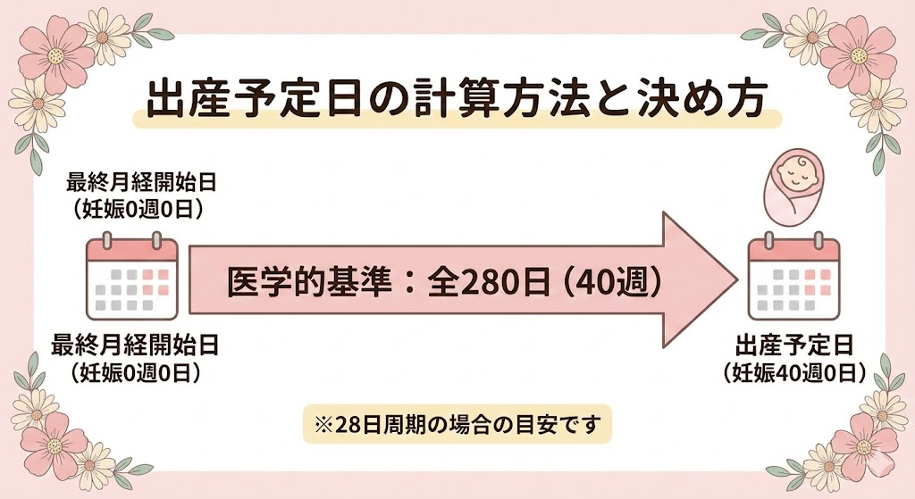 出産予定日は、医学的な基準に基づき、妊娠期間を 280日(40週)として計算します。この280日という期間は、最終月経の開始日を 妊娠0週0日 とし、そこから数えて40週目に出産を迎えると想定したものです。