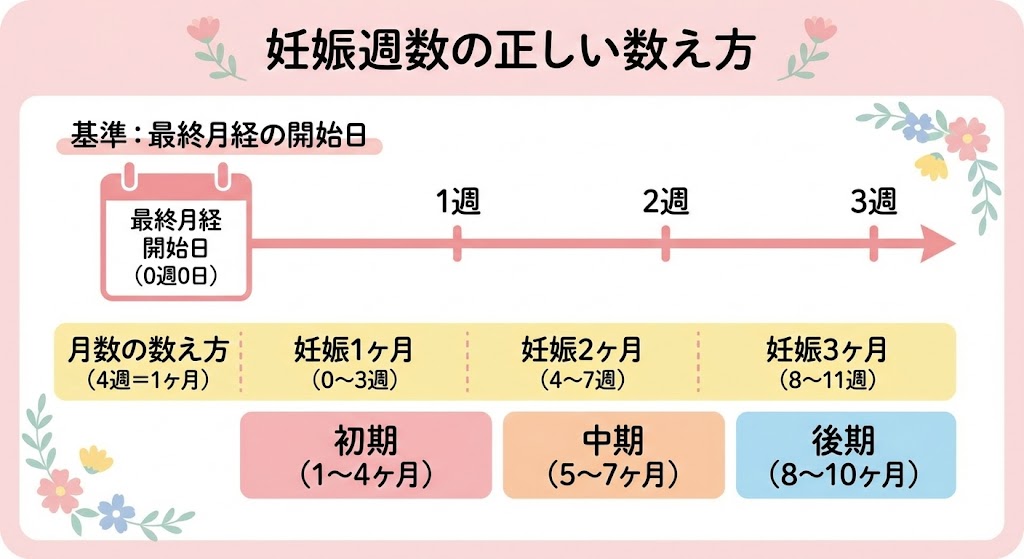 妊娠週数の計算は、最終月経の開始日を基準にして行われます。つまり、最終月経の初日が妊娠0週0日とされ、そこから1週間ごとに妊娠週数が増えていきます。