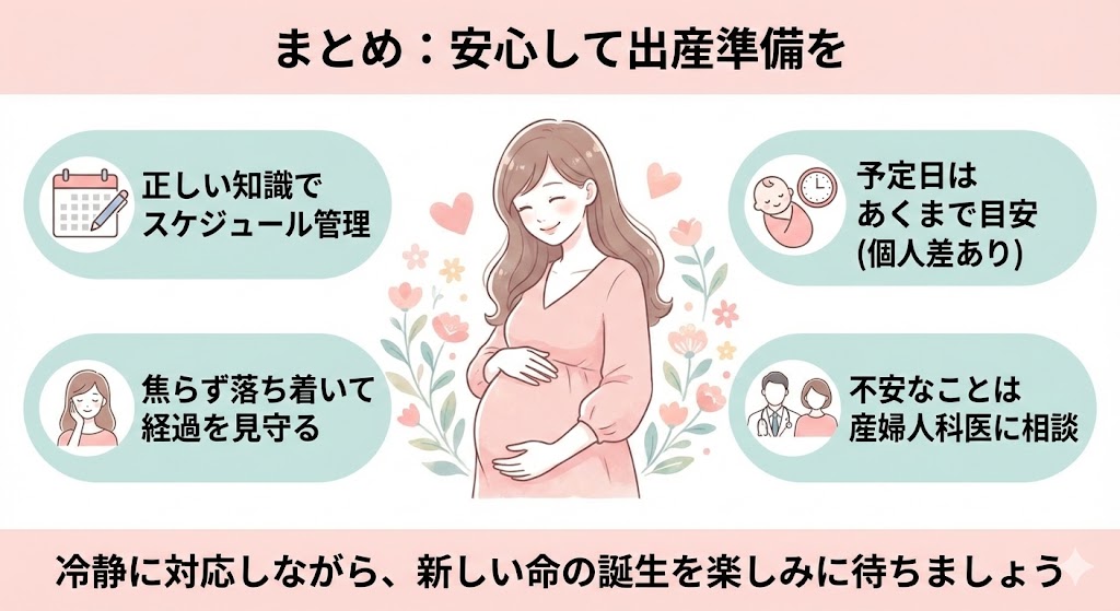 妊娠期間はさまざまな変化があり、不安や疑問も多くなるかもしれませんが、正しい情報をもとに冷静に対応しながら、安心して出産に向けた準備を進めていきましょう。