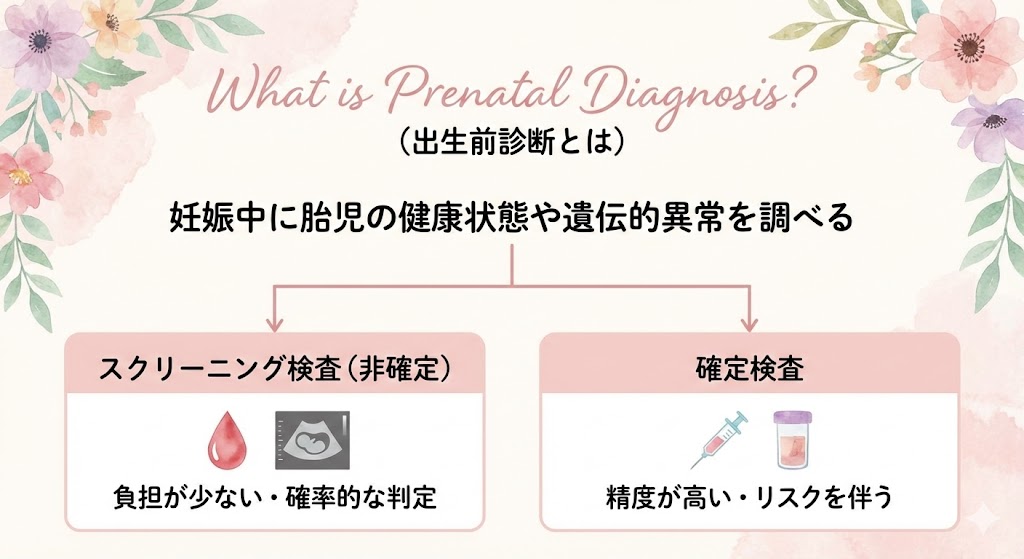 出生前診断とは、妊娠中に胎児の健康状態や遺伝的な異常を調べる検査のことを指します。胎児の染色体異常や先天性疾患の有無を早期に把握することで、出産に向けた準備や治療の選択肢を考える機会を提供します。主にスクリーニング検査(非確定検査)と確定検査の2種類があり、それぞれ検査方法や目的が異なります。