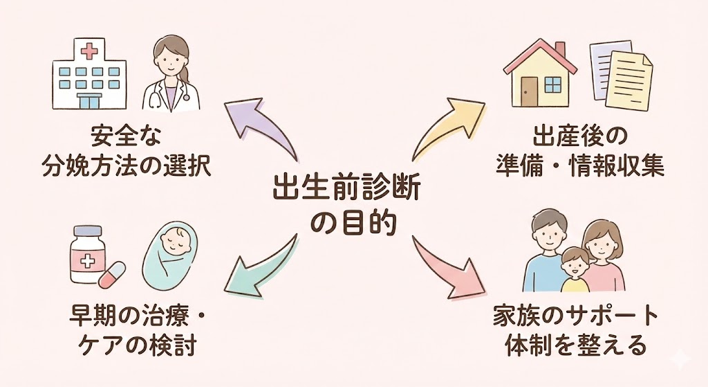 出生前診断の目的は、胎児の健康状態を把握し、妊娠や出産、育児に向けた適切な準備を整えることにあります。胎児に何らかの異常が見つかった場合、出産後の生活にどのような変化が生じるのか、どのような支援制度を利用できるのかといった情報を事前に収集し、家族全体で適切なサポート体制を整えることができます。