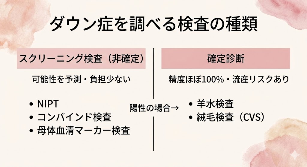 胎児のダウン症を調べる出生前診断の種類は次のとおりです。